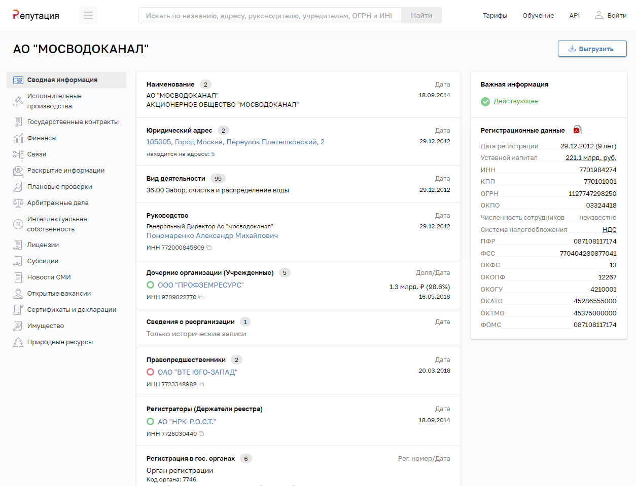 мониторинг и отслеживание изменений – смена юридического адреса, руководителей, их доли и уставного капитала, а также присвоение нового кода ОКВЭД;