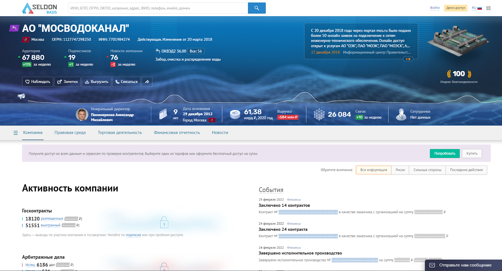 Пробный период: базовый набор предоставляется бесплатно — в том числе краткая справка об участии в арбитражных делах и суммах иска.
