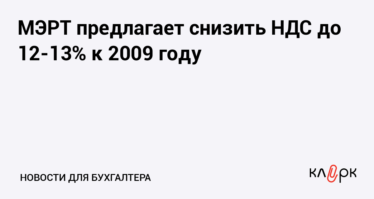 МЭРТ предлагает снизить НДС до 12-13% в 2009 г. при отмене льготной ставки в 10%. Принять поправки «целесообразно» уже в весеннюю сессию Думы, говорится в письме, которое глава ведомства Эльвира Набиуллина направила вице-премьеру, главе Минфина Алексею Кудрину.