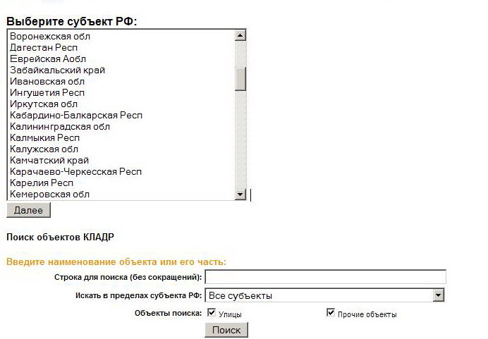 Для поиска объектов необходимо выбрать из списка субъект РФ, ввести наименование объекта или его часть в строке поиска (без сокращений), указать объект поиска: «улицы» или «прочие объекты».