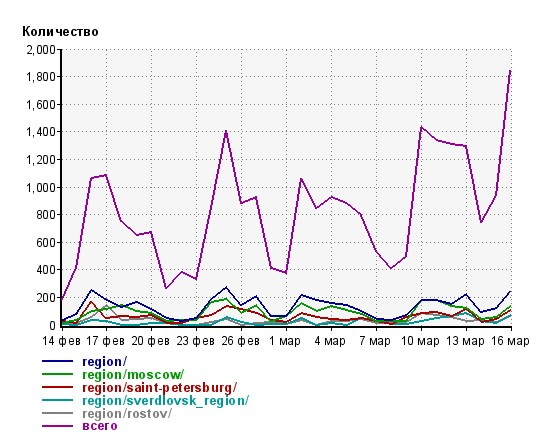 Так, если 14 февраля было зафиксировано 200 просмотров региональных материалов, то к 16 марта их число составило более 1800.