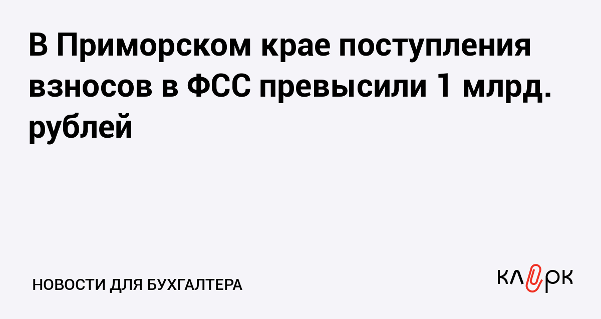 Приморский ФСС сообщает, что общая сумма, поступившая в региональное отделение Фонда по двум видам страхования, составила более 1 млрд. рублей.