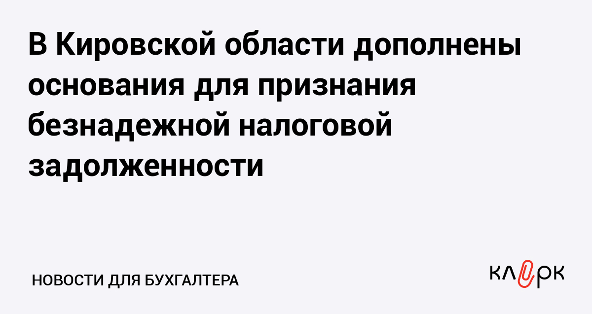 В Кировской области утвержден закон, который устанавливает дополнительные основания признания безнадежными к взысканию недоимки по региональным налогам, задолженности по пеням и штрафам по этим налогам.