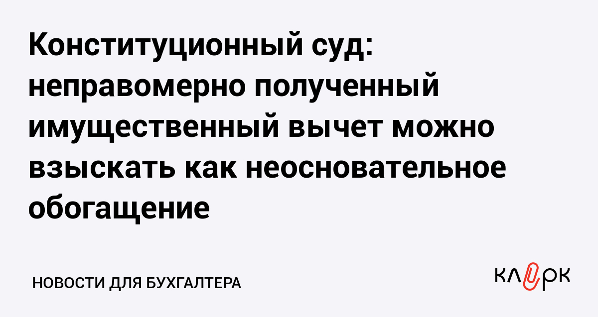 Конституционный суд 24 марта 2017 года рассмотрел вопрос о взыскании с налогоплательщика необоснованно полученного имущественного вычета по НДФЛ. В суд обратились три гражданина по одной и той же причине - с них взыскали имущественный вычет как неосновательное обогащение (согласно нормам Гражданского кодекса).