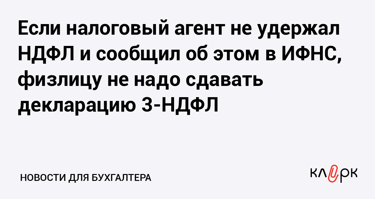 Если налоговый агент не удержал НДФЛ и сообщил об этом в ИФНС, физлицу не надо сдавать декларацию 3-НДФЛ