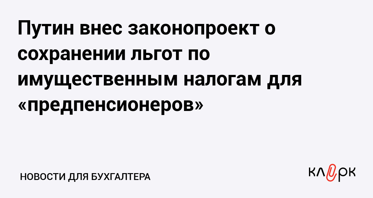 Президент РФ Владимир Путин внес на рассмотрение в Госдуму проект федерального закона, который предусматривается сохранение федеральных льгот по имущественным налогам, предоставляемым в настоящее время пенсионерам, для физических лиц, соответствующих условиям назначения пенсии, действующим по состоянию на 31 декабря 2018 г.