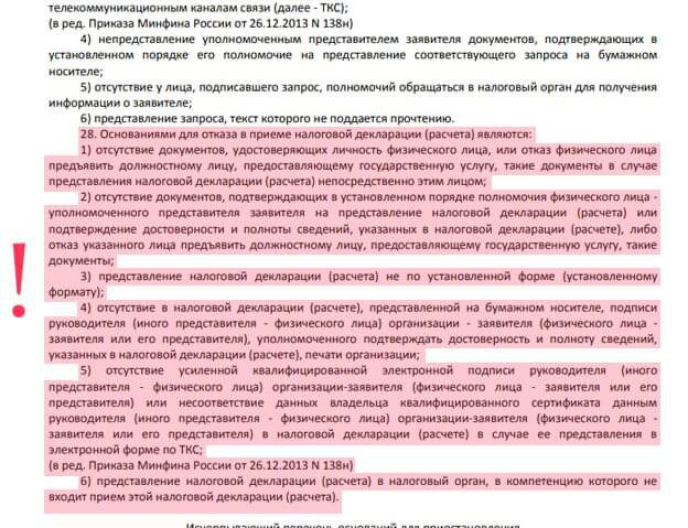 Краткая справочка по п.28 Административного регламента ФНС России или «6 причин для отказа в приеме декларации»: