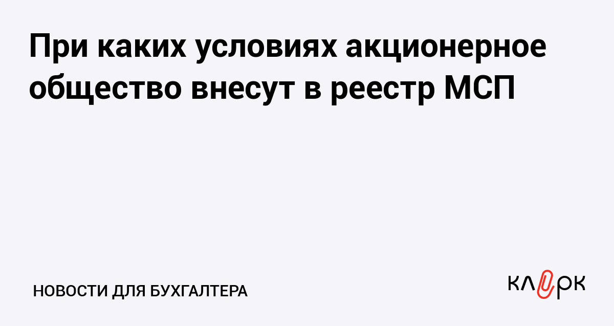 В силу статьи 4 Федерального закона № 209-ФЗ от 24.07.2007 «О развитии малого и среднего предпринимательства в Российской Федерации» акционерные общества для включения в реестр МСП, помимо соответствия условиям по ССЧ и по доходу, должны соответствовать одному из требований, установленных подпунктами «б» - «е» пункта 1 части 1.1 статьи 4 Федерального закона № 209-ФЗ. Об этом сообщает Минфин в письме № 03-12-13/64154 от 07.09.2018.