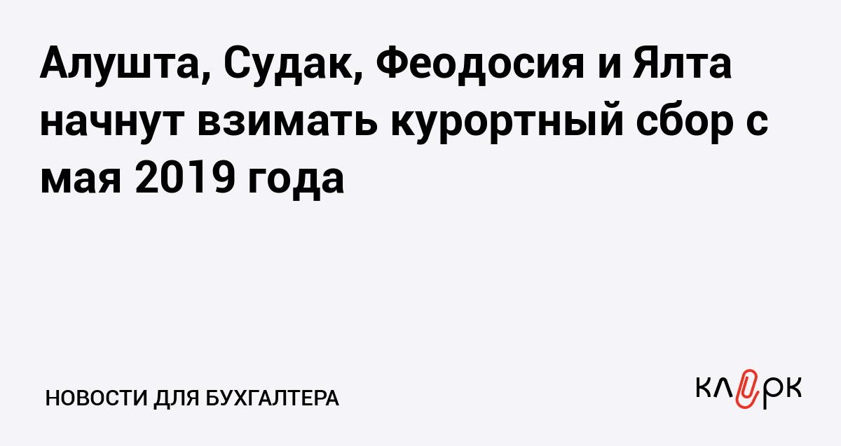 Парламент Крыма в ноябре 2017 года ввел 10-рублевый курортный сбор с приезжающих на отдых туристов с мая 2018 года. В эксперименте, который планировали проводить ежегодно с 1 мая до 30 сентября, согласились участвовать Алушта, Евпатория, Саки, Судак, Феодосия, Ялта и Черноморский район. Однако в апреле 2018 года Госсовет Крыма отложил начало эксперимента на год — на май 2019 года.