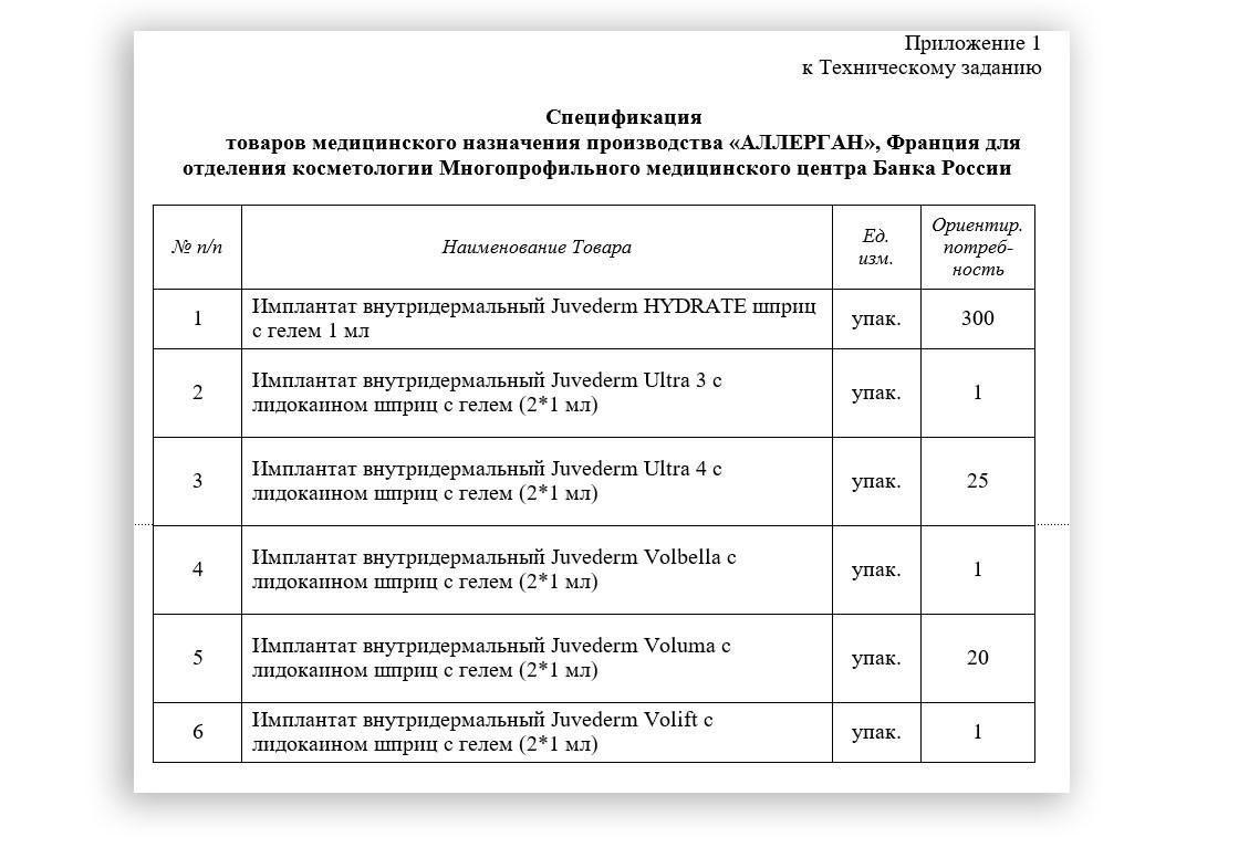 300 внутридермальных имплантов марки Juvederm компании «Аллерган» для контурной пластики лица и губ обойдутся ЦБ в 2,2 млн рублей.