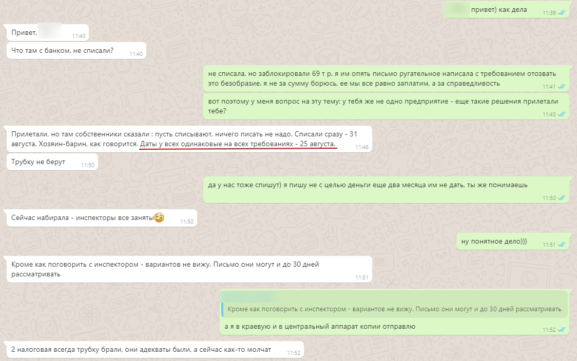 «История с блокировками не закончилась. Несмотря на то, что на решение о блокировке средств на счете был направлен ответ с обоснованным требованием его отзыва, блокировка все-таки прилетела — в пятницу вечером после окончания рабочего дня. Сегодня отправили новое письмо — просим решение все-таки отозвать и блокировку снять, обещаем пожаловаться в краевое управление и центральный аппарат ФНС. Пока не отозвали, но посмотрим, что будет».