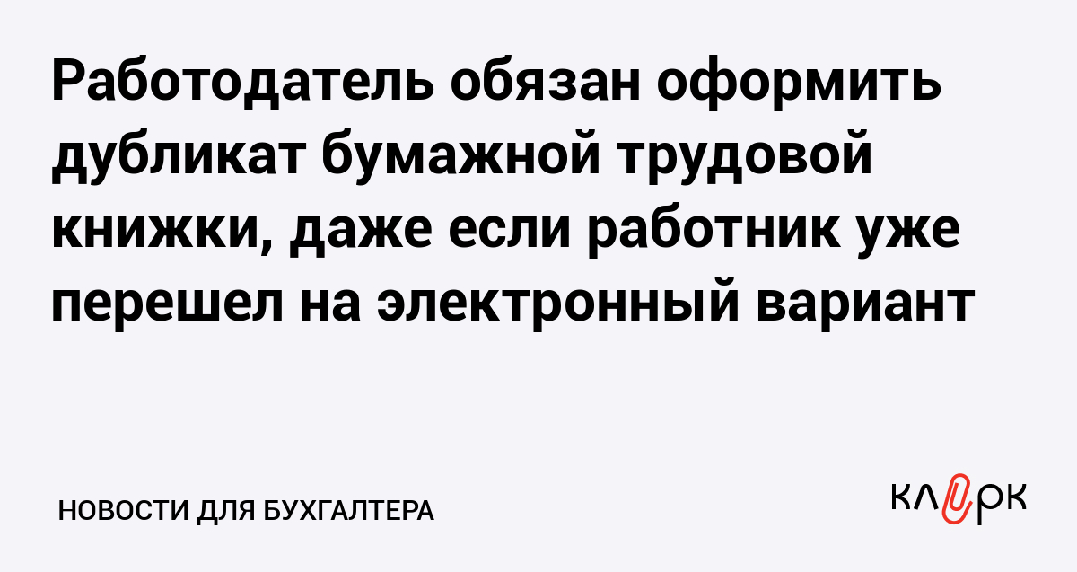 Работодатель обязан оформить дубликат бумажной трудовой книжки, даже если работник уже перешел на электронный вариант