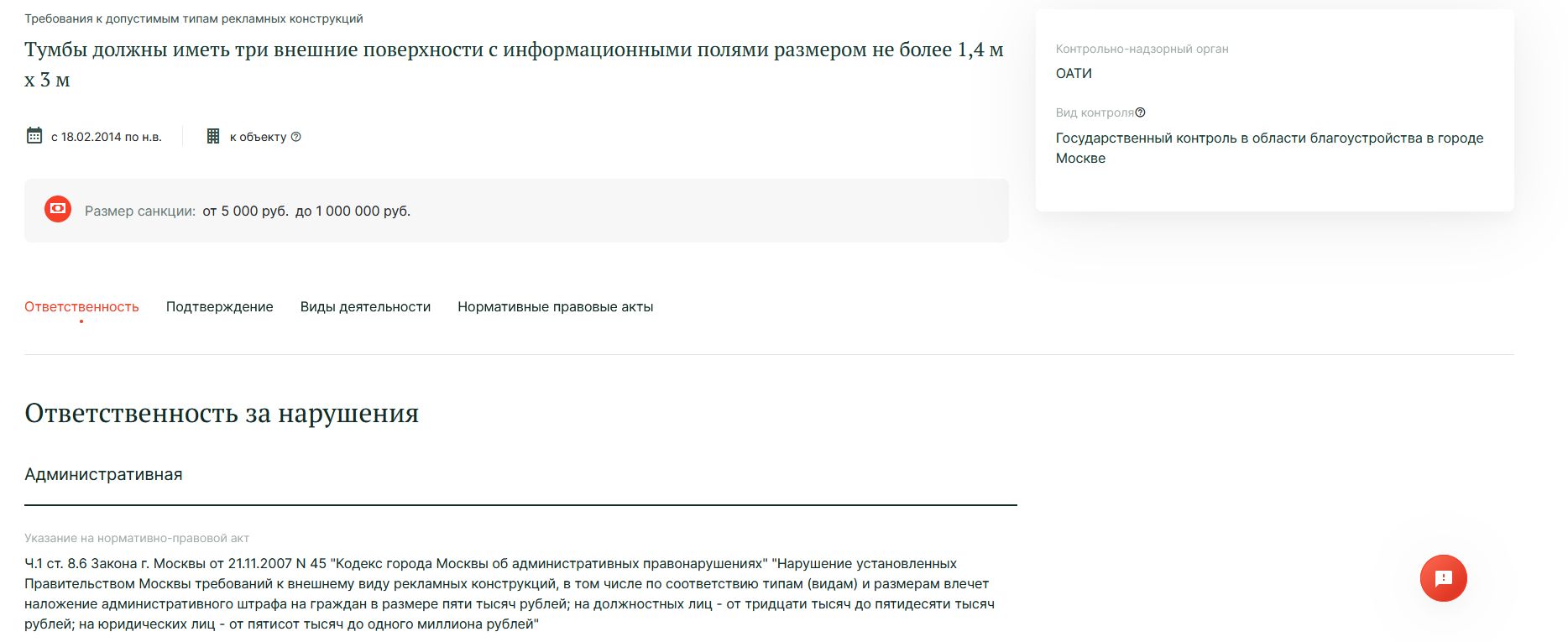Вот если не всматриваться, сразу видно про некие тумбы, их размеры, и самое главное — штрафы при несоблюдении до 1 миллиона. Только приглядевшись, видно мелкий шрифт вверху — о размерах рекламных конструкций.