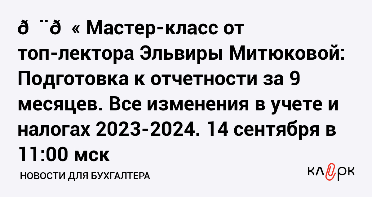👨🏫 Мастер-класс от топ-лектора Эльвиры Митюковой: Подготовка к отчетности за 9 месяцев. Все изменения в учете и налогах 2023-2024. 14 сентября в 11:00 мск