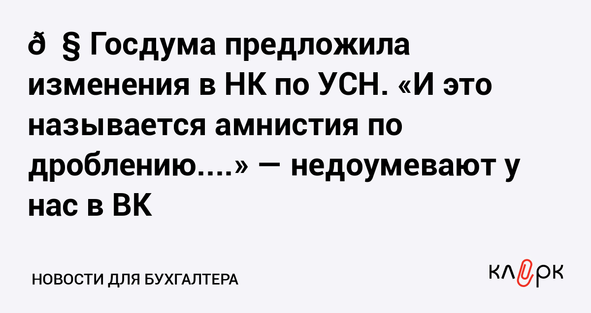 😧 Госдума предложила изменения в НК по УСН. «И это называется амнистия по дроблению....» — недоумевают у нас в ВК