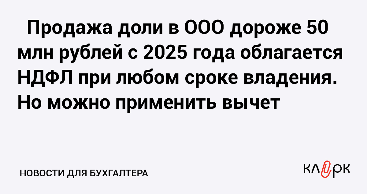 ❗ Продажа доли в ООО дороже 50 млн рублей с 2025 года облагается НДФЛ при любом сроке владения. Но можно применить вычет