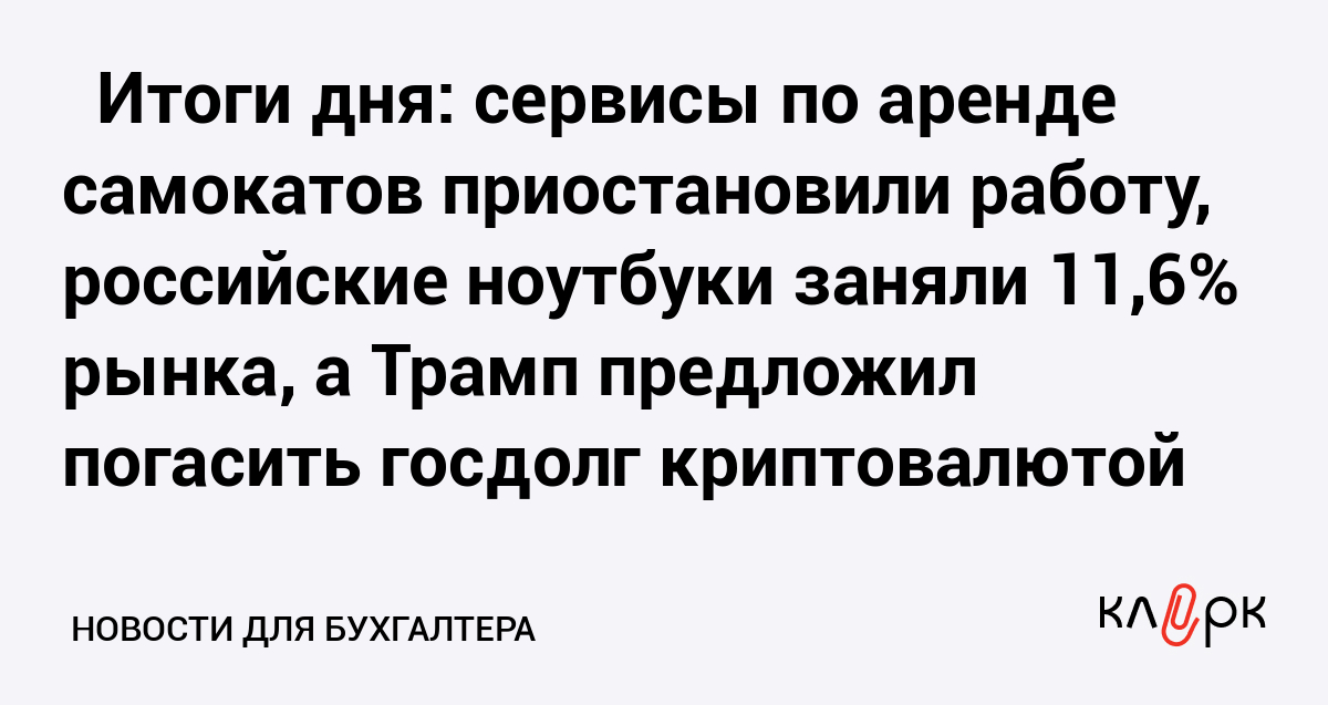 ⚡️ Итоги дня: сервисы по аренде самокатов приостановили работу, российские ноутбуки заняли 11,6% рынка, а Трамп предложил погасить госдолг криптовалютой