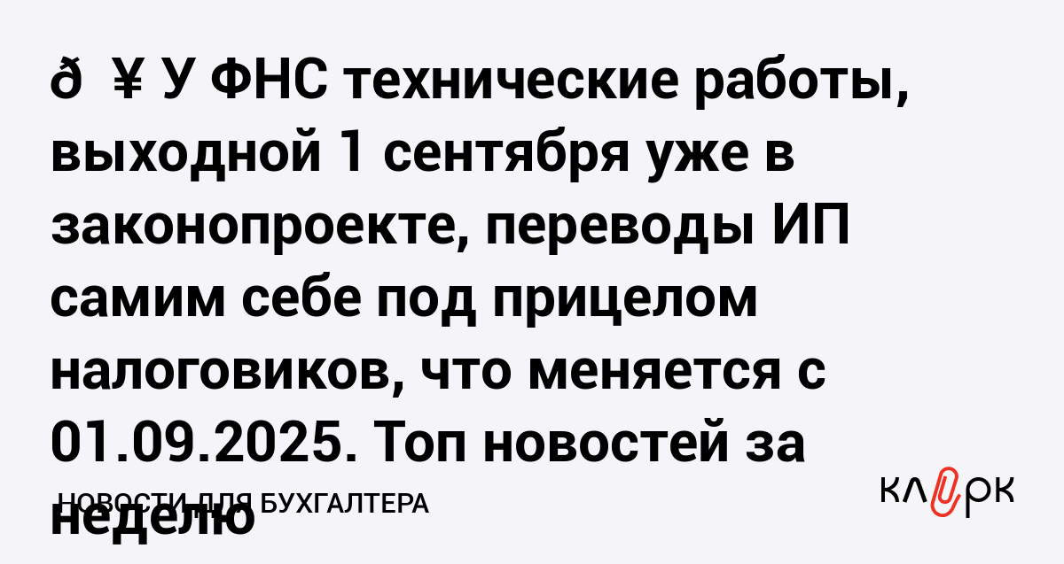 💥 У ФНС технические работы, выходной 1 сентября уже в законопроекте, переводы ИП самим себе под прицелом налоговиков, что меняется с 01.09.2025. Топ новостей за неделю