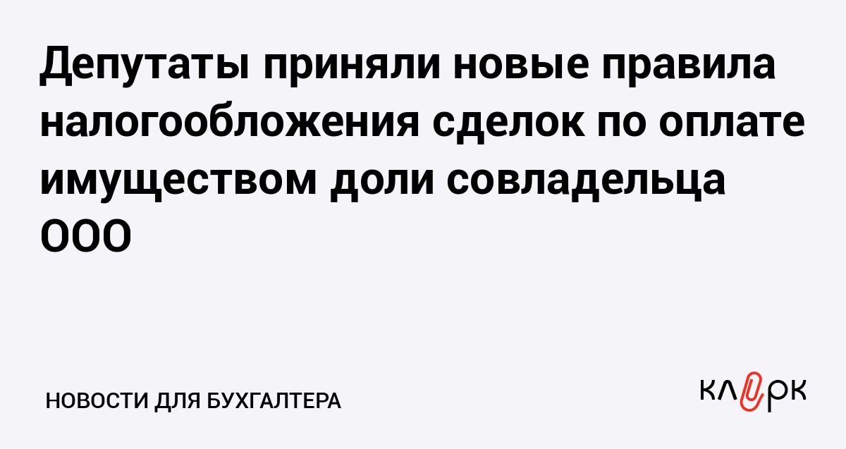 Депутаты приняли новые правила налогообложения сделок по оплате имуществом доли совладельца ООО