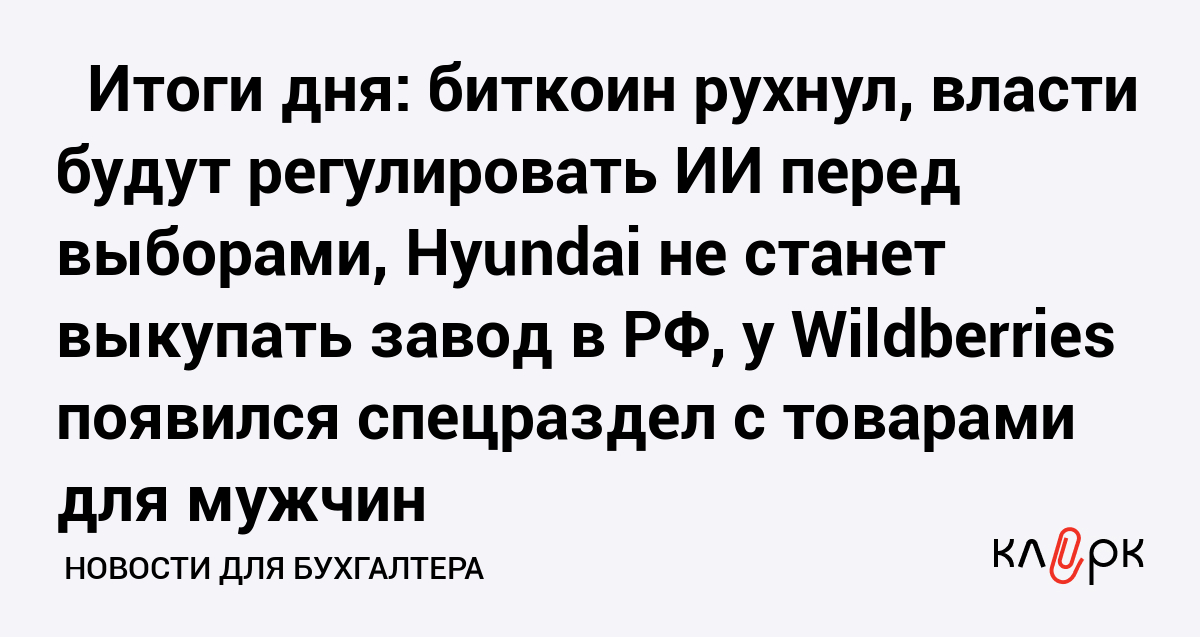 ⚡️ Итоги дня: биткоин рухнул, власти будут регулировать ИИ перед выборами, Hyundai не станет выкупать завод в РФ, у Wildberries появился спецраздел с товарами для мужчин