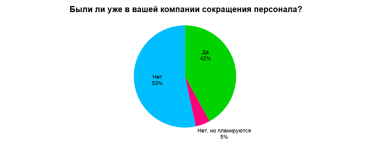 42% работодателей проводили сокращения персонала в компании после того, как начался кризис 2014 г. Еще 5% еще не сокращали персонал, но собираются. Каждая вторая компания сумела избежать сокращений.