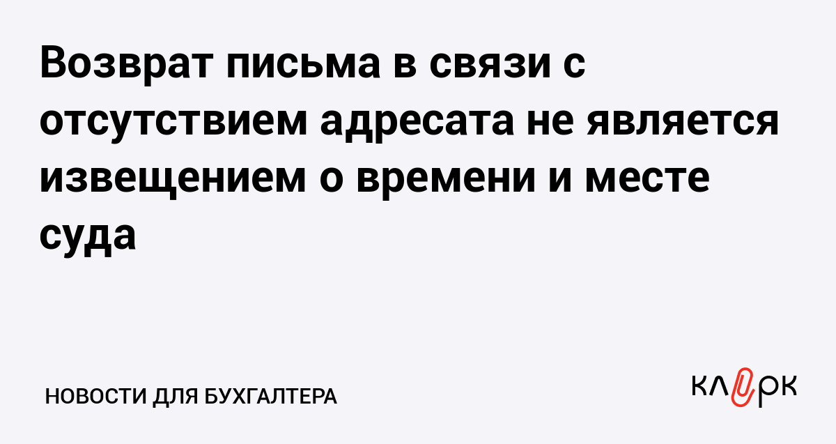 ФАС Северо-Западного округа в Постановлении № А56-34430/2010 от 11.03.2011 признал, что возврат почтовой корреспонденции со ссылкой на отсутствие адресата не свидетельствует о надлежащем извещении лица о месте и времени судебного заседания.