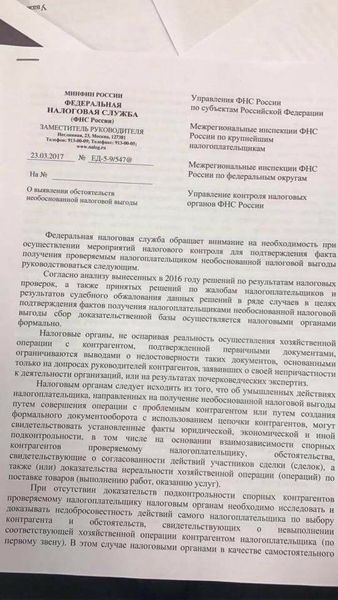 ФНС разослала по нижестоящим управлениям письмо № ЕД-5-9-547/@ от 23.03.2017, в котором призывает перестать начислять компаниям дополнительные налоги за формальные нарушения и делать акцент на реальность и законность проверяемой операции.