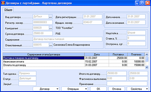 В данной реализации договор рассматривается как документ, предназначенный для регистрации сделки продажи или сделки закупки с партнером. Договоры используются для оформления длительных, многоэтапных отношений. Ближайшим аналогом договора является счет на оплату, но в счете всегда используются стандартные условия поставки и оплаты. Есть и еще одно существенное отличие. Договор всегда регистрирует только финансовую сторону сделки без описания спецификаций. Наконец, договор выступает или может выступать объектом расчетов по сделкам в новой системе расчетов. Если расчеты с партнером осуществляются по договорам, то при выполнении хозяйственных операций по поставкам или оплатам состояние расчетов по договору будет отслеживаться автоматически без ввода каких-либо иных данных. Однако ссылка на договор может быть указана в документах и без использования договора в качестве объекта расчетов. В этом случае договор выступает своеобразной скобкой, которая объединяет некоторую совокупность документов, связанных с этим договором.