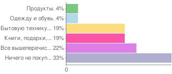 Книги и подарки в режиме онлайн покупает 19% опрошенных. Тот же процент имеет бытовая техника. На одежду и обувь пришлось 4%, столько же на продукты питания, а все вышеперечисленное покупает 22% ответивших.