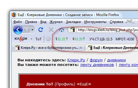 Вышла новая версия Клерк.Бара для Mozilla Firefox. В новой версии появилась справочная информация (курсы валют, МРОТ, ставка ЦБРФ), которая обновляется автоматически. Кроме того, теперь все кнопки Клерк.Бара если они не помещаются в одну строку, не пропадут, их можно вызвать нажав на "стрелочки". Исправлена функция логина и запросов обновлений (в результате чего иногда возникали лишние запросы к серверу.