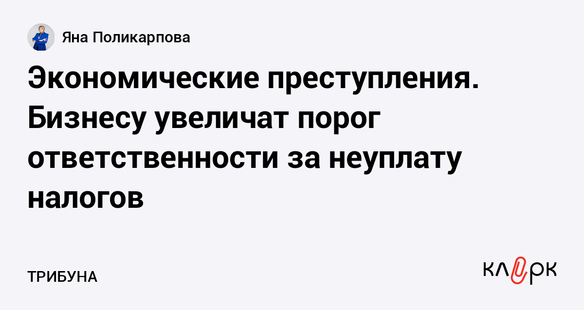 Предполагается, например, что преступление будут считать совершенным в крупном размере, если сумма неуплаты налогов, сборов, взносов превысит 35 млн руб., а в особо крупном — 100 млн руб. за 3 финансовых года подряд. Сейчас эти пороги составляют 15 и 45 млн руб.