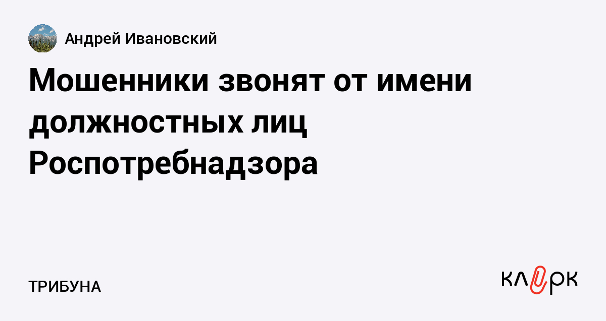 О «новом» (на самом деле, ничего нового тут нет) способе нажиться на доверчивых людях рассказали в Псковском Управлении Роспотребнадзора. Некоторые СМИ пишут, что злодеи звонят и представляются главой Роспотребнадзора (Анной Поповой что ли?), но именно в Управлении указали, что представляются главой регионального управления. Что, наверное, будет больше похоже на правду, оно надо главе ведомства лично кому названивать?