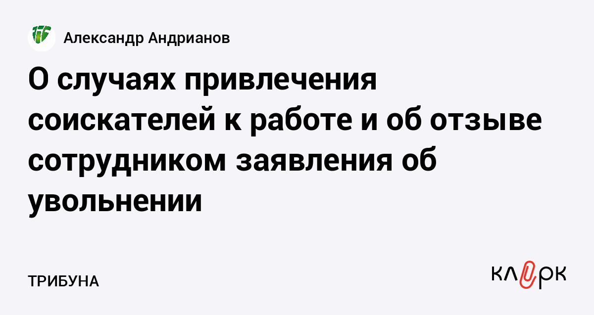 Если трудовой договор будет расторгнут с сотрудником, отозвавшим заявление в иных случаях, у Организации существует риск привлечения к административной ответственности в виде штрафа до 50 тыс. руб., а также риск обращения сотрудника в суд с последующим восстановлением на работе.