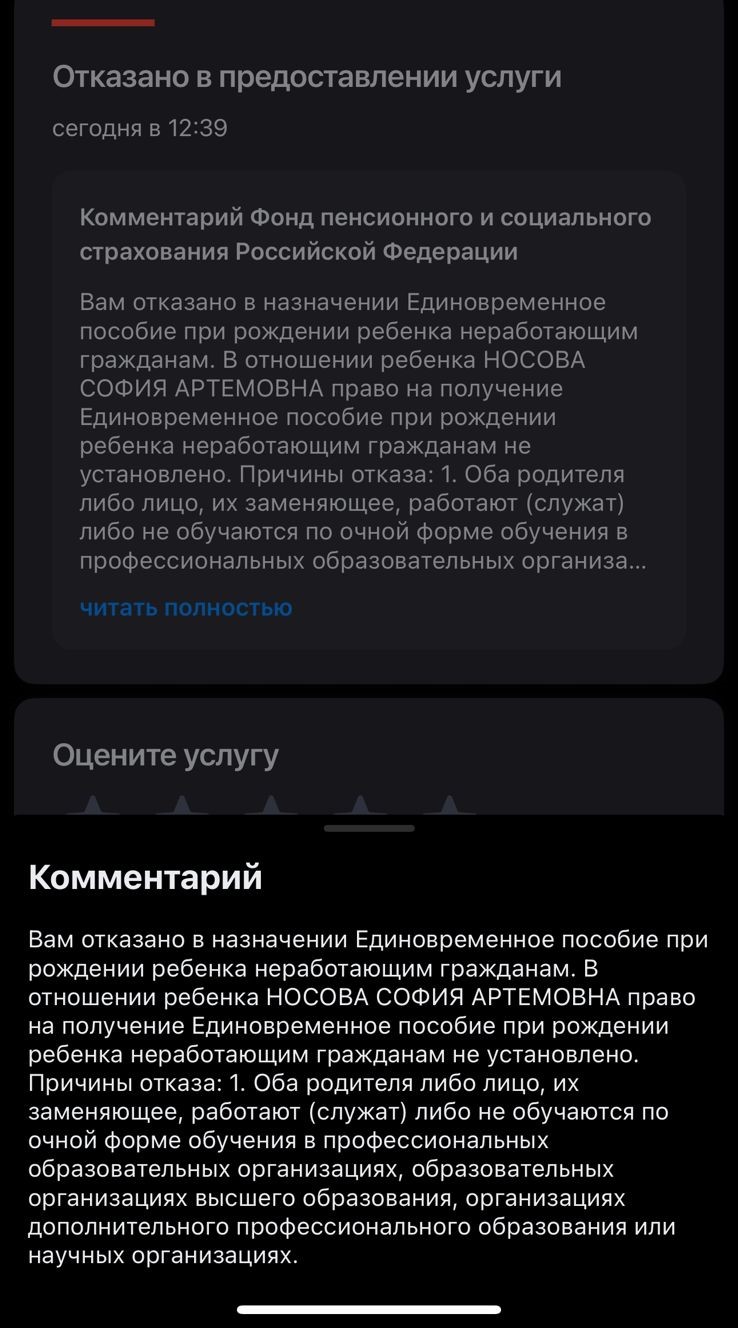 На единовременное пособие по рождению подавали через Госуслуги, но был отказ по непонятной для меня причине - посмотрите, пожалуйста, прикреп.картинку