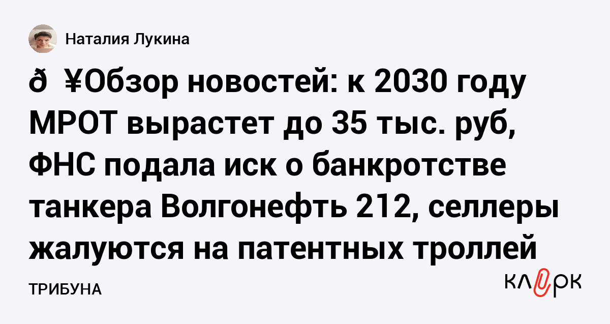 💥Обзор новостей: к 2030 году МРОТ вырастет до 35 тыс. руб, ФНС подала иск о банкротстве танкера Волгонефть 212, селлеры жалуются на патентных троллей