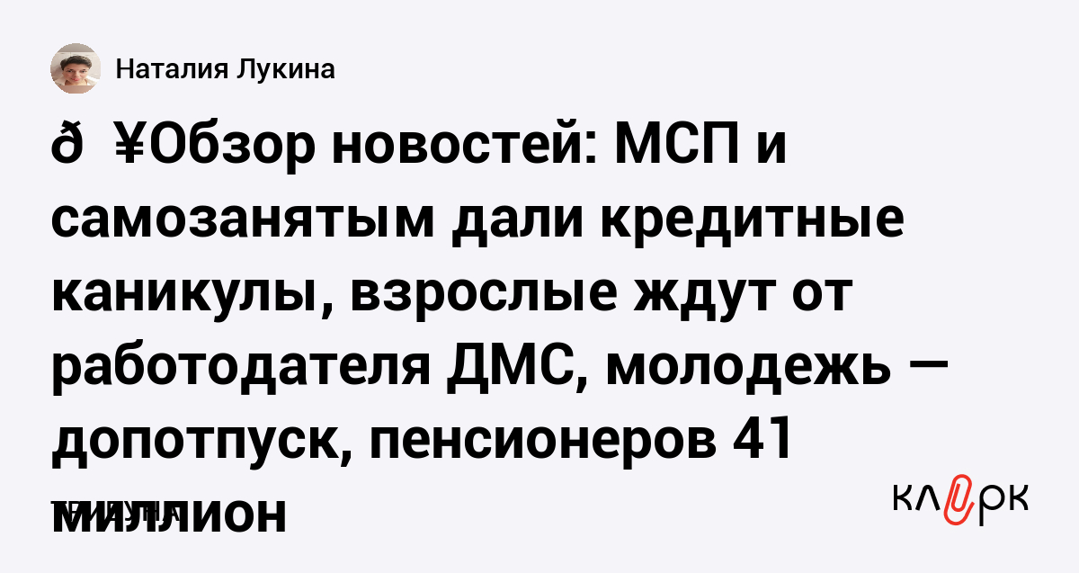 💥Обзор новостей: МСП и самозанятым дали кредитные каникулы, взрослые ждут от работодателя ДМС, молодежь — допотпуск, пенсионеров 41 миллион