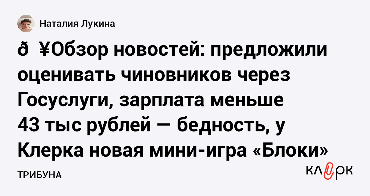 💥Обзор новостей: предложили оценивать чиновников через Госуслуги, зарплата меньше 43 тыс рублей — бедность, у Клерка новая мини-игра «Блоки»