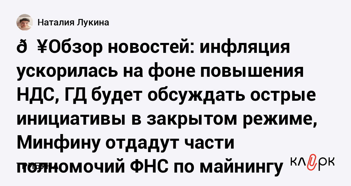 💥Обзор новостей: инфляция ускорилась на фоне повышения НДС, ГД будет обсуждать острые инициативы в закрытом режиме, Минфину отдадут части полномочий ФНС по майнингу