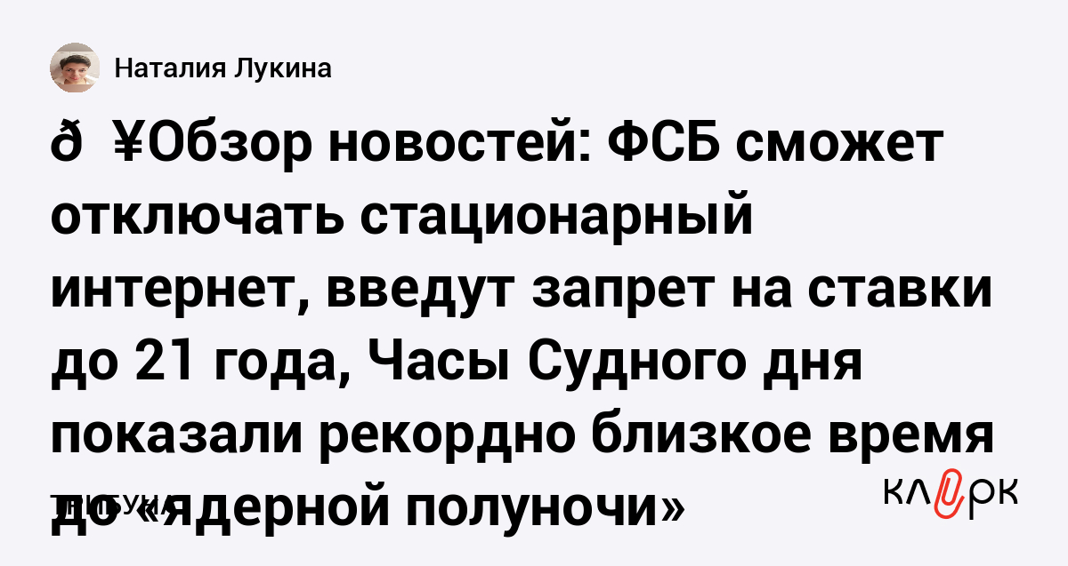 💥Обзор новостей: ФСБ сможет отключать стационарный интернет, введут запрет на ставки до 21 года, Часы Судного дня показали рекордно близкое время до «ядерной полуночи»