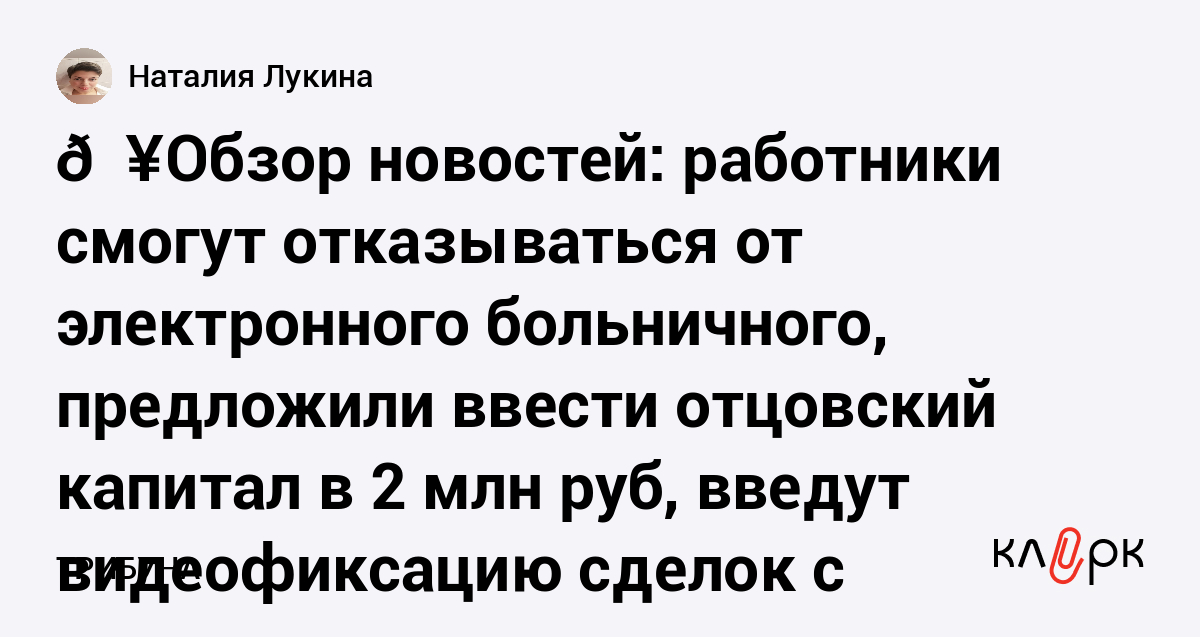 💥Обзор новостей: работники смогут отказываться от электронного больничного, предложили ввести отцовский капитал в 2 млн руб, введут видеофиксацию сделок с недвижимостью