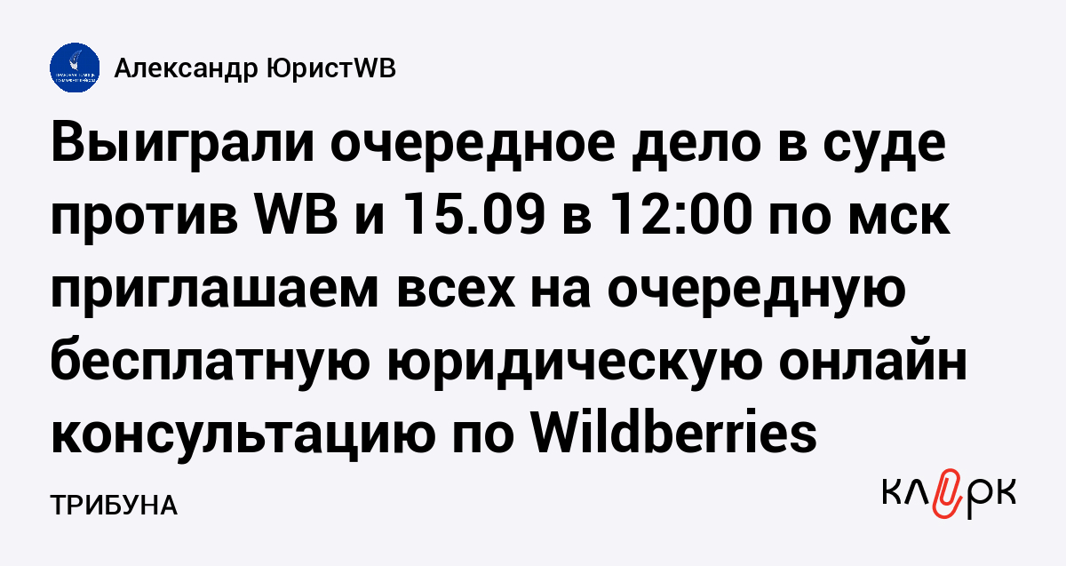 По такому случаю, виду победы по очередному судебному делу против Вб, 15.09 в 12:00 по мск приглашаем всех на очередную бесплатную юридическую онлайн консультацию по Wildberries.