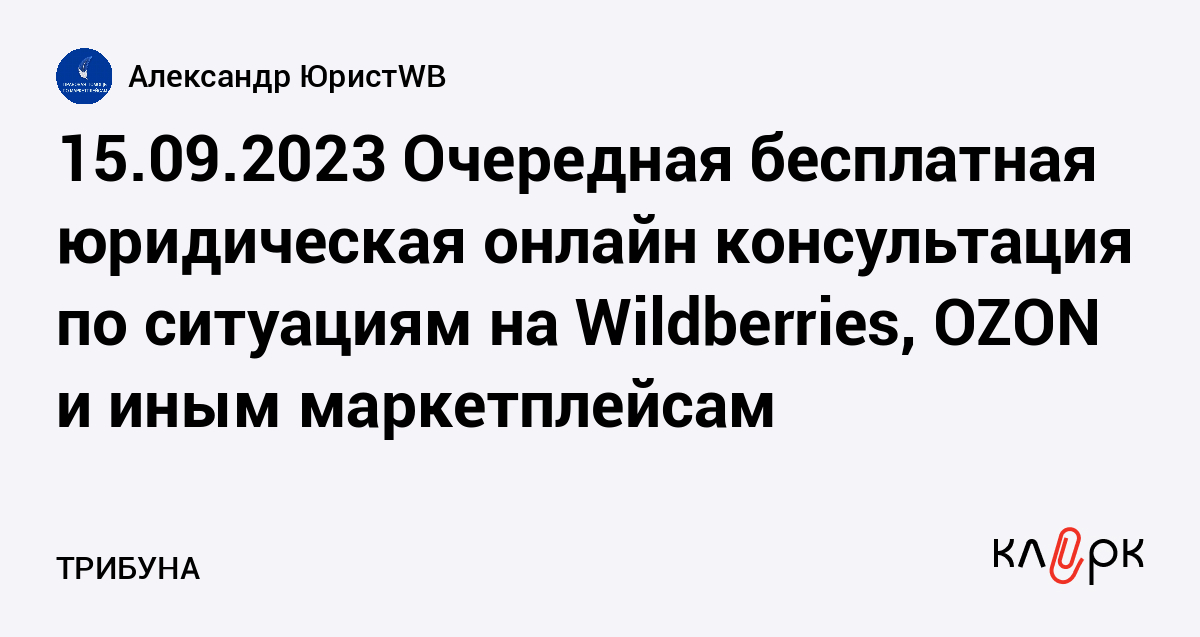 15.09.2023 Очередная бесплатная юридическая онлайн консультация по ситуациям на Wildberries, OZON и иным маркетплейсам