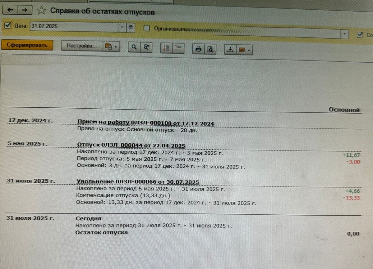 Добрый день. Подскажите, пожалуйста, столкнулись на дня со следующей ситуацией в 1С ЗУП. Работник устроен 17.12.2024, уволился по собственному желанию 31.07.2025. В мае брал 3 дня отпуска. Количество полных месяцев для расчета дней для компенсации за неиспользованный отпуск согласно Правилам, утв. НКТ СССР 30.04.1930 N 169 п. 28 и п. 35 - 8 месяцев, кол-во дней составит 28 / 12 * 8 = 18,67 дней, минус 3 дня отпуска, итого к расчету за 15,67 дней. Но в остатках отпусков числится 13,33 дн на 31.07.2025. Что это такое, как это исправить? Первый раз с таким столкнулись.