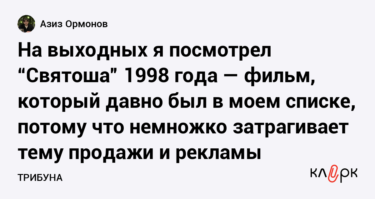 На выходных я посмотрел “Святоша” 1998 года — фильм, который давно был в моем списке, потому что немножко затрагивает тему продажи и рекламы
