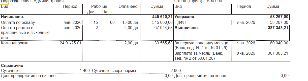 Документ по начислению создан, отображается в списке "все начисления" от 25.11.25 - Доход в натуральной форме, вид начисления - Суточные в пределах нормы и сверх нормы, соответственно, дата выплаты 26.11.25