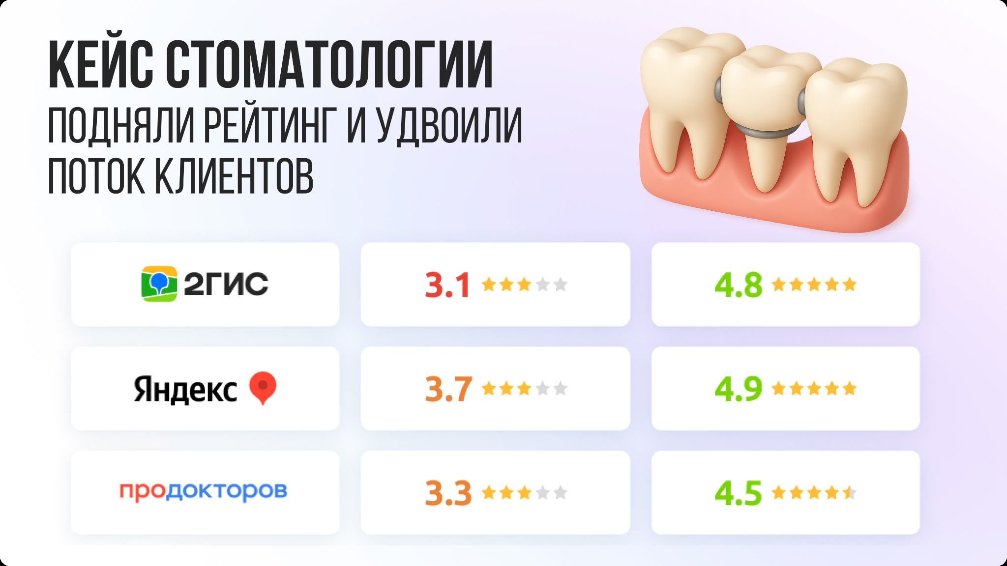 Стоматология теряла 30% клиентов из-за рейтинга 3,0. Кейс:как мы это исправили и повысили его до 4,8