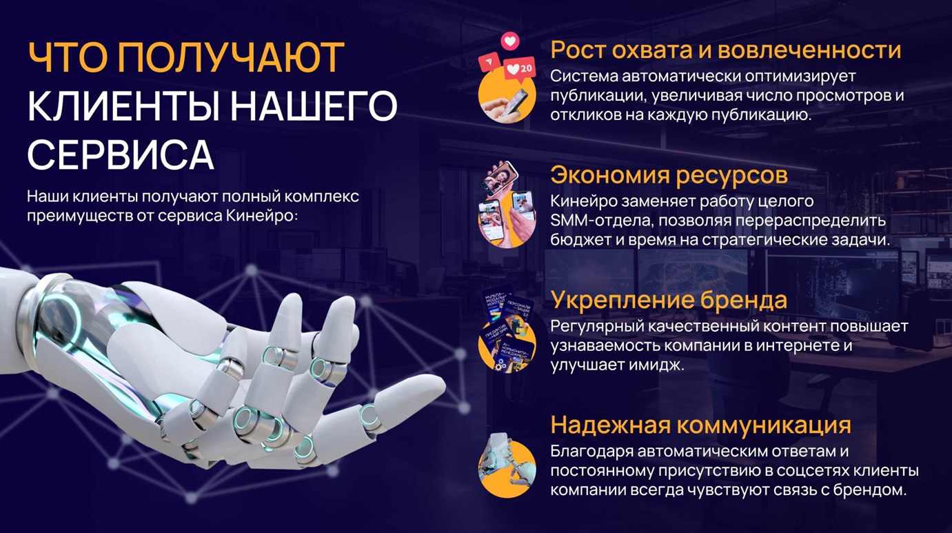 Проблема: Качество ИИ-контента может хромать. Решение: «Кинейро» дает обучение по промпт-инжинирингу и готовые шаблоны. Плюс всегда есть ручная доработка — это занимает 10-15 минут вместо часов написания с нуля.