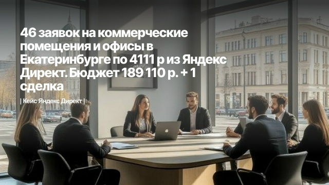 Продвижение коммерческой недвижимости. 46 заявок на коммерческие помещения и офисы в Екатеринбурге по 4111 р. Яндекс Директ. Бюджет 189 110 р. + 1 сделка