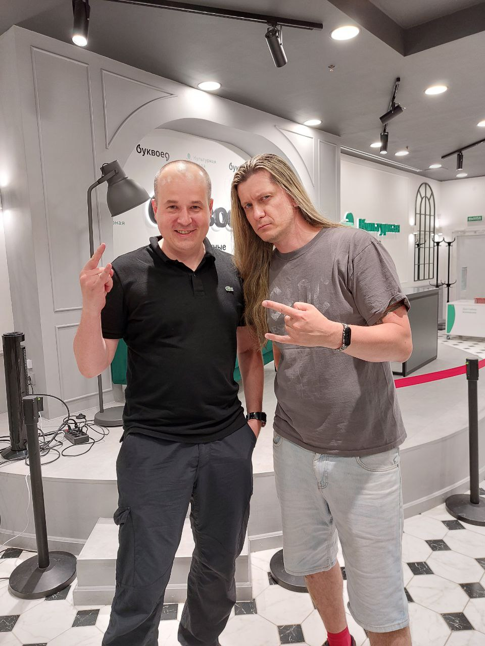 А на фото мы с рецензентом неделю назад в Питере. Наверное, тяжело столько волос в такую жару носить — моя прическа практичнее будет 😄