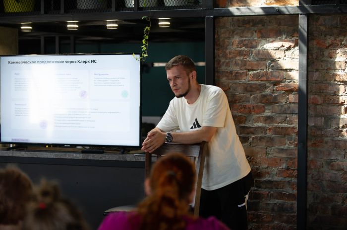 Этот тот самый Сергей из отдела маркетинга. У Сергея есть план. В августе он хочет научить робота «Клерка» продавать на 600 тысяч в месяц. Ждем, Сережа.